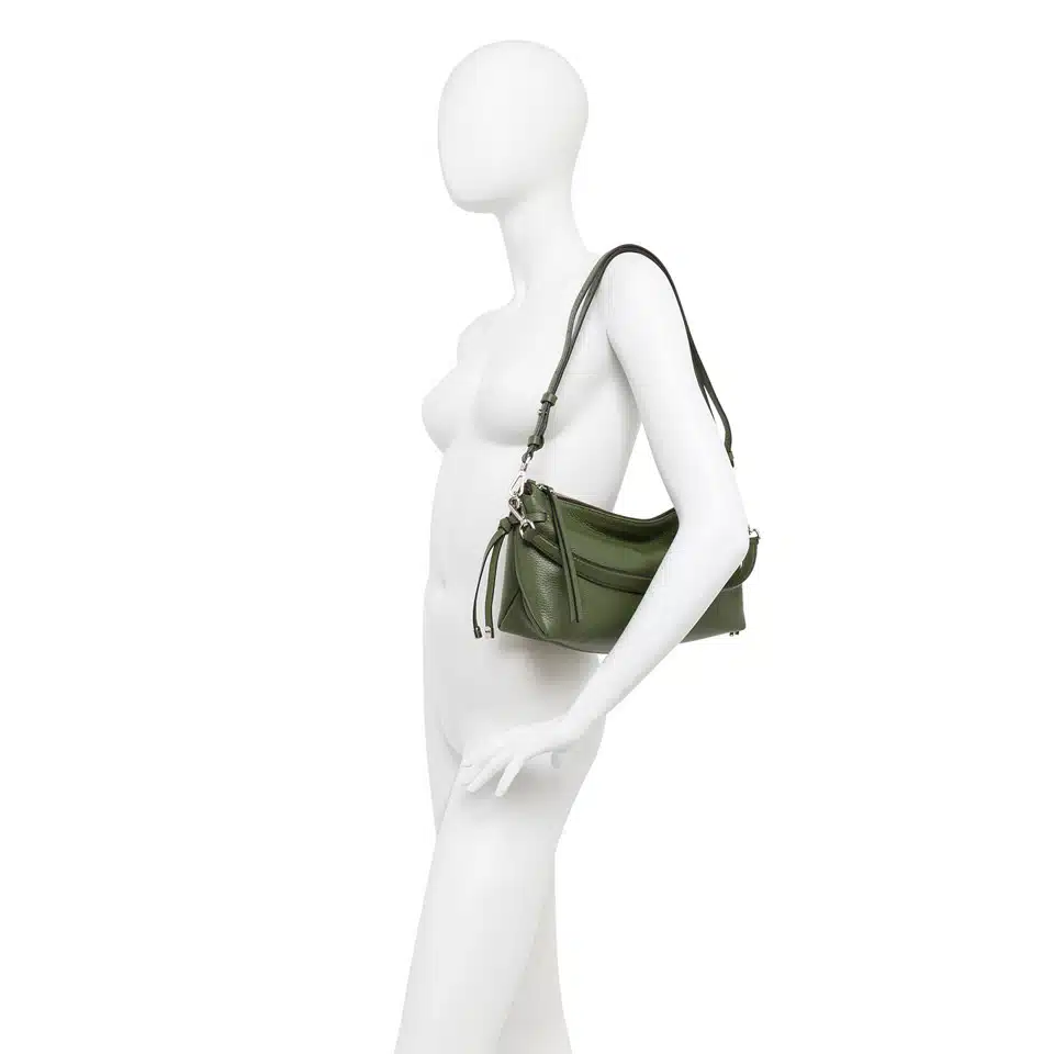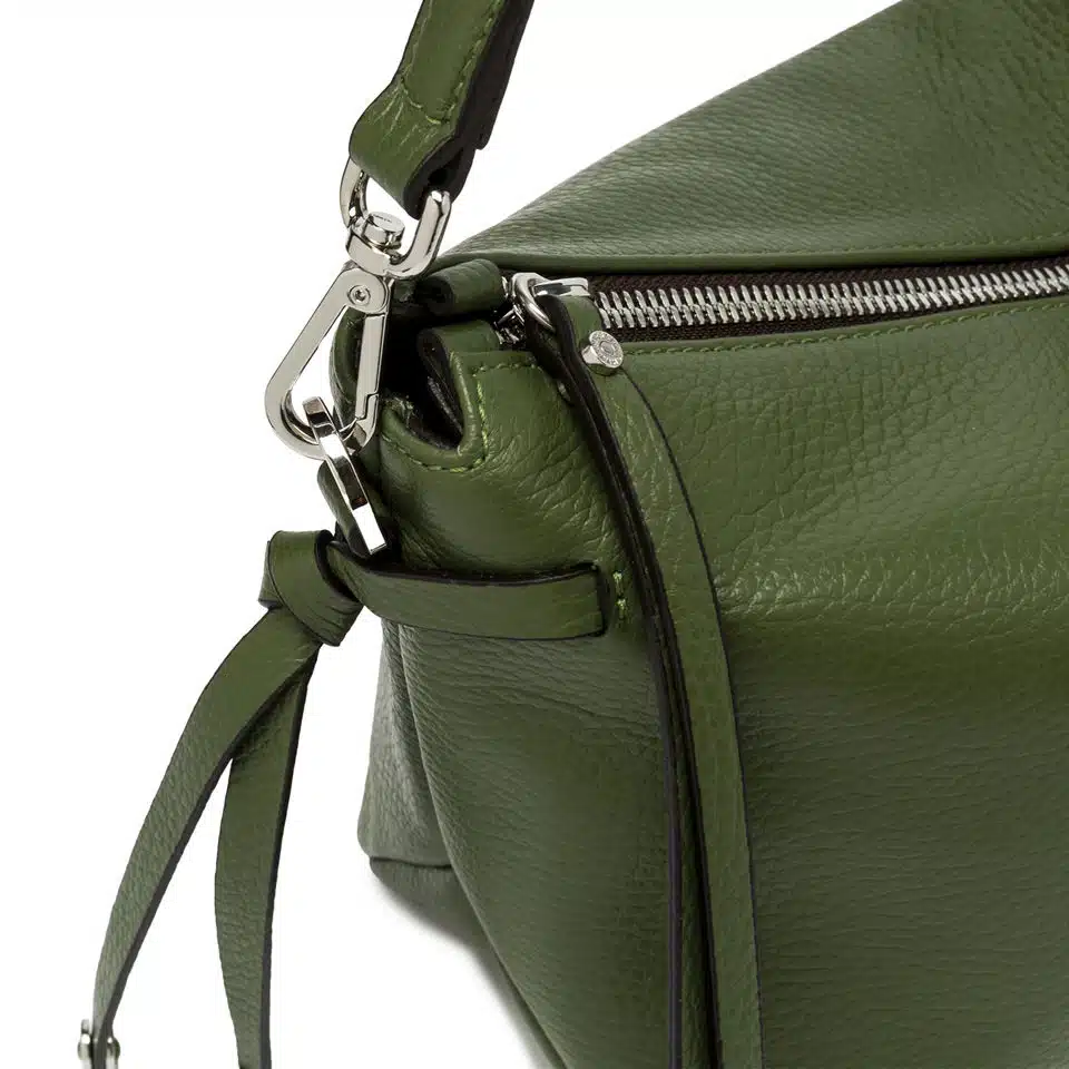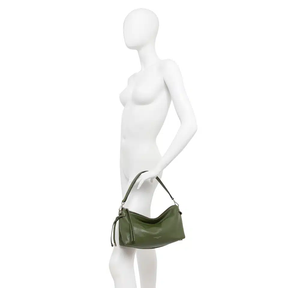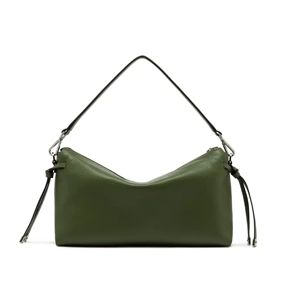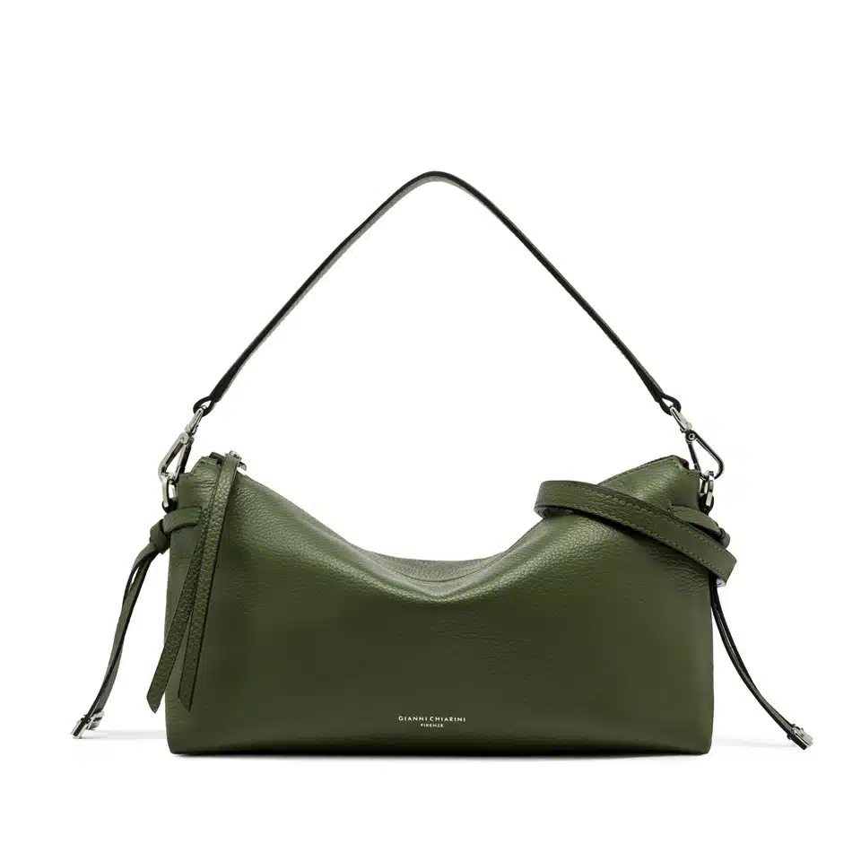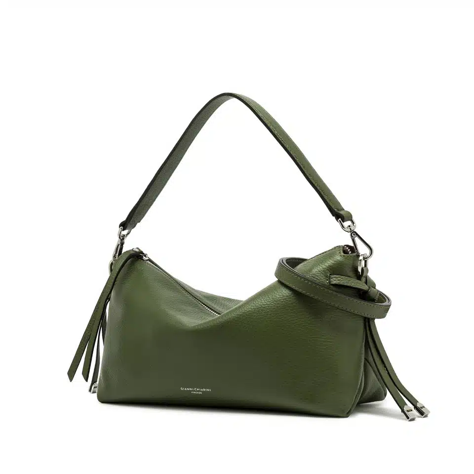 Brina by Gianni Chiarini Firenze è una borsa in pelle martellata con linee minimal e squadrate. I dettagli annodati e i componenti in metallo aggiungono un tocco luminoso. È dotata di un manico in pelle per essere indossata comodamente a spalla e di una tracolla regolabile e removibile, ideale per un’opzione crossbody.