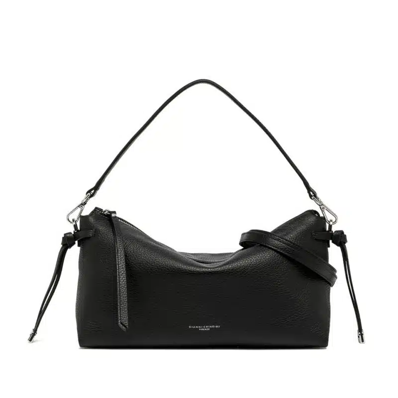 Brina by Gianni Chiarini Firenze è una borsa in pelle martellata con linee minimal e squadrate. I dettagli annodati e i componenti in metallo aggiungono un tocco luminoso. È dotata di un manico in pelle per essere indossata comodamente a spalla e di una tracolla regolabile e removibile, ideale per un’opzione crossbody.