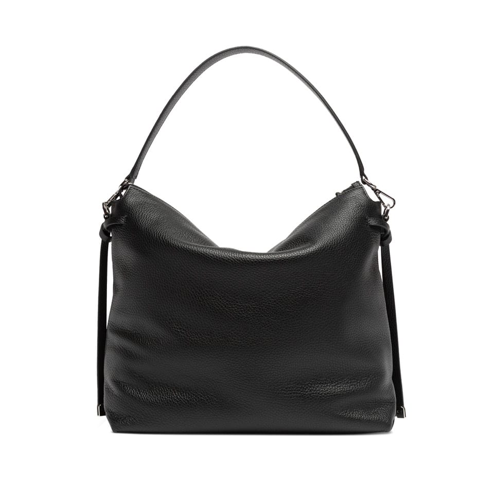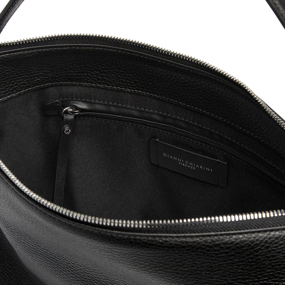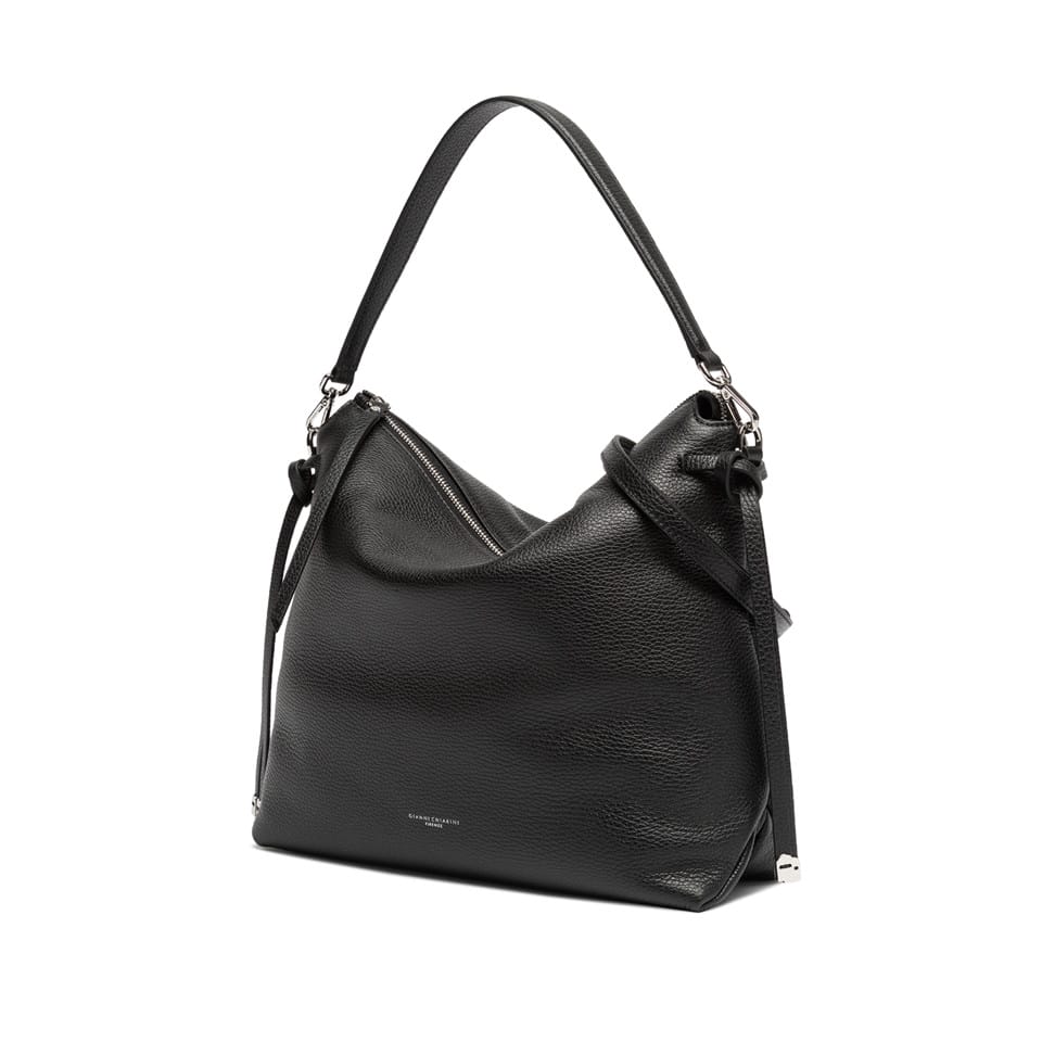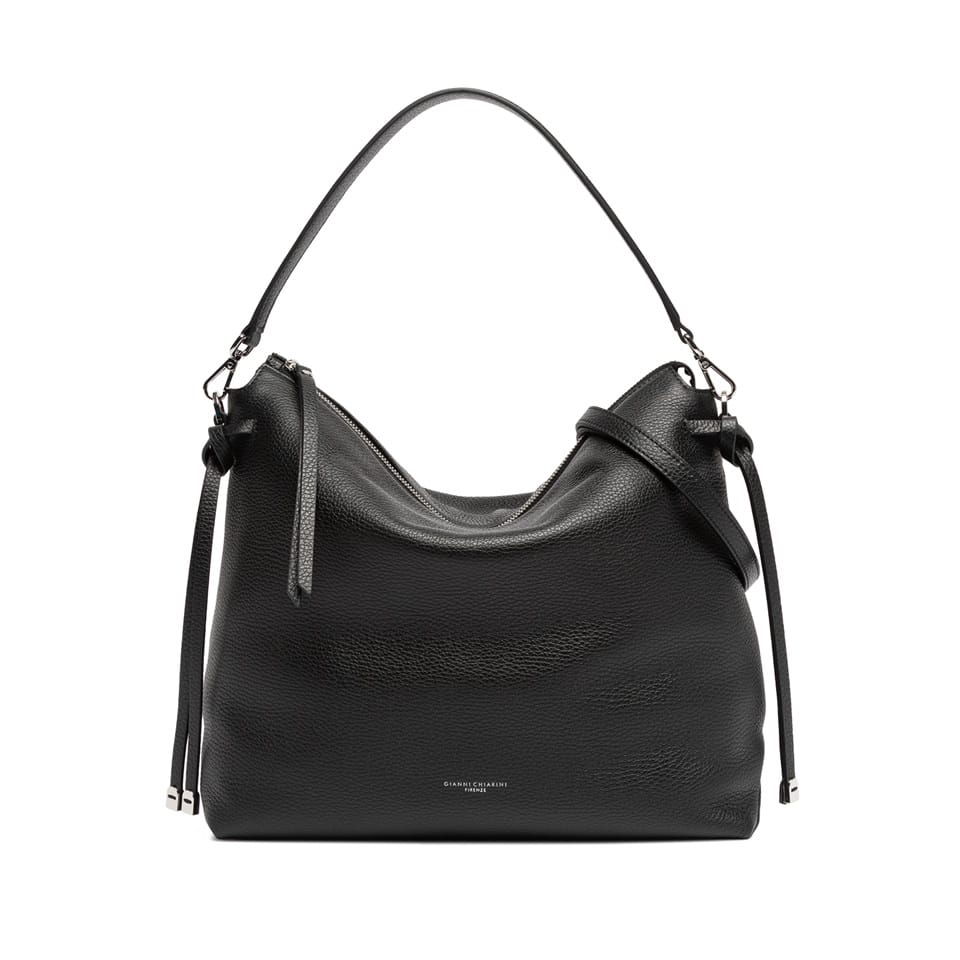 Brina by Gianni Chiarini Firenze è una borsa in pelle martellata con linee minimal e squadrate. I dettagli annodati e i componenti in metallo aggiungono un tocco luminoso. È dotata di un manico in pelle per essere indossata comodamente a spalla e di una tracolla regolabile e removibile, ideale per un’opzione crossbody. La chiusura superiore con zip garantisce sicurezza e praticità .