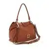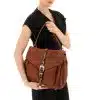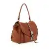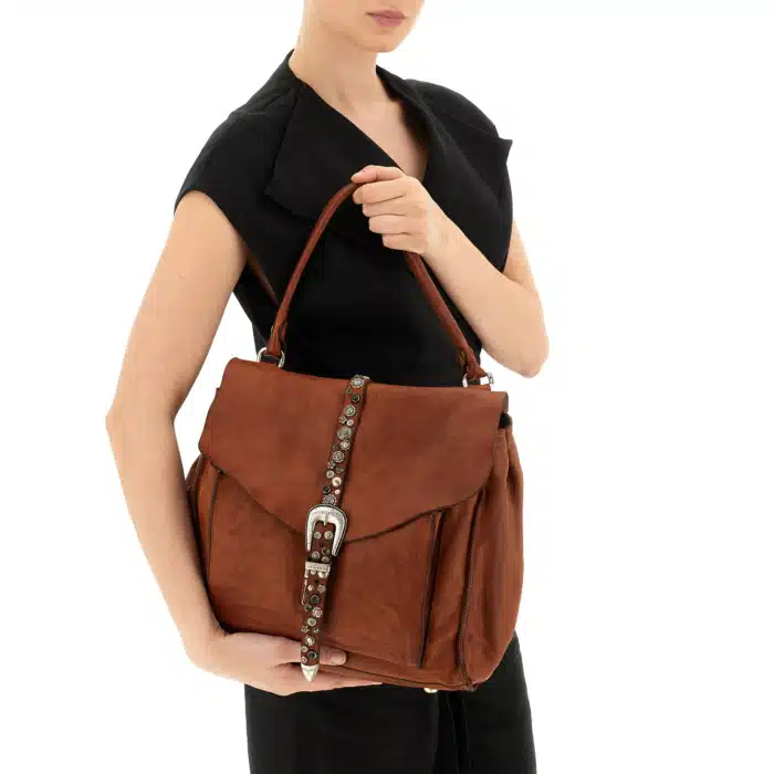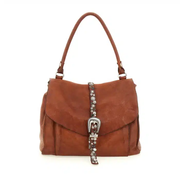 Monospalla “Emilia” in pelle di vacchetta tinta in capo con borchie e strass