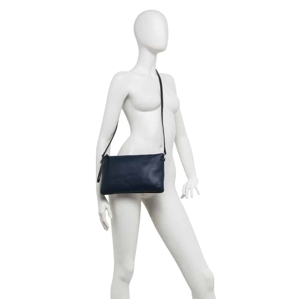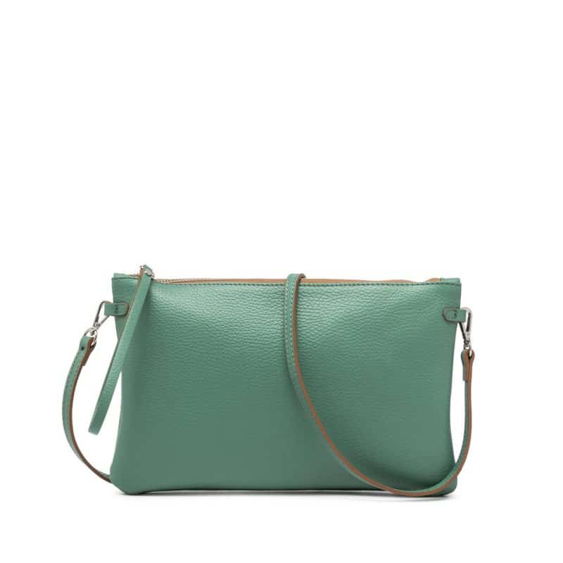 Hermy in grana dollaro, clutch con zip in testa. Tracolla in pelle di servizio.