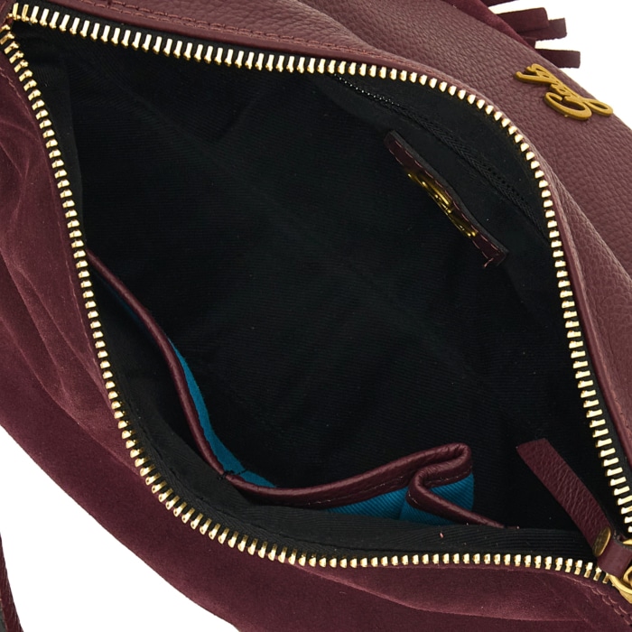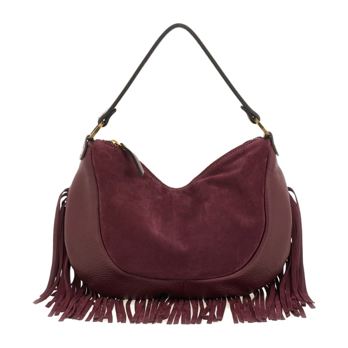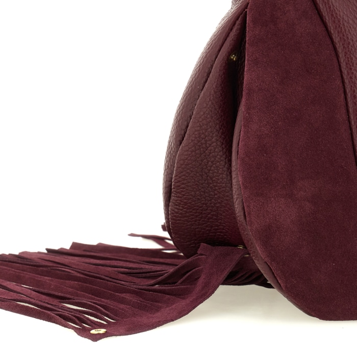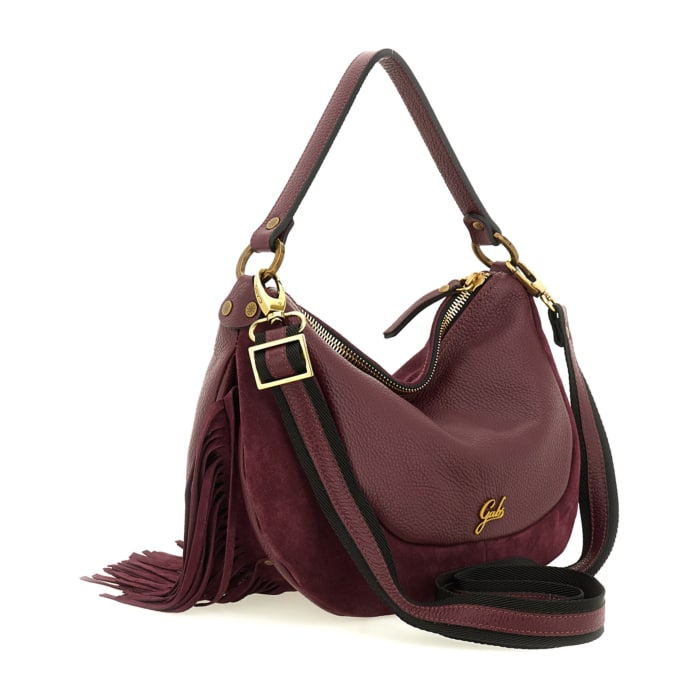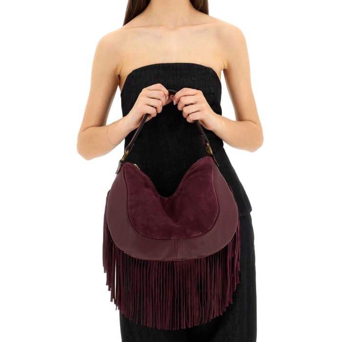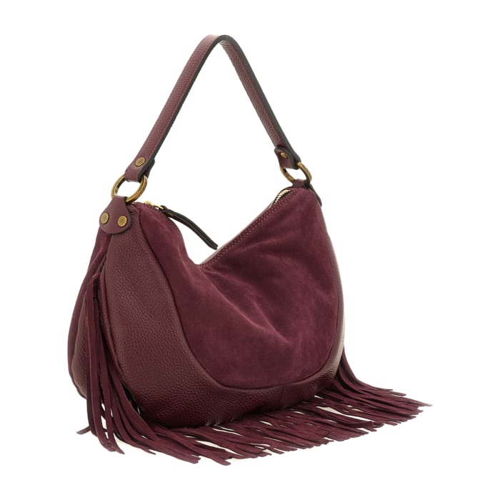Linea Trinidad Special – Borsa a spalla in pelle di vitello scamosciata e vitello martellato con frange rimovibili