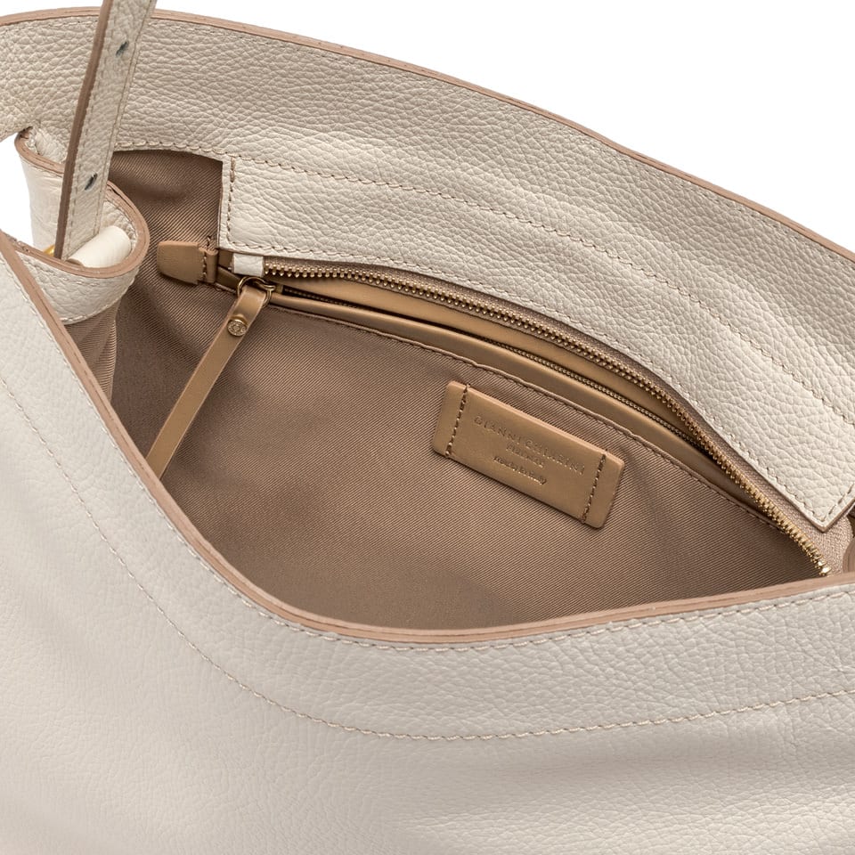 La linea Ottavia by Gianni Chiarini Firenze è realizzata in pelle martellata. Capiente e daily è caratterizzata da una doppia portabilità : crossbody o a mano grazie alla maniglia regolabile. Arricchita dal grande gemello logato e dotata di una chiusura superiore con zip.