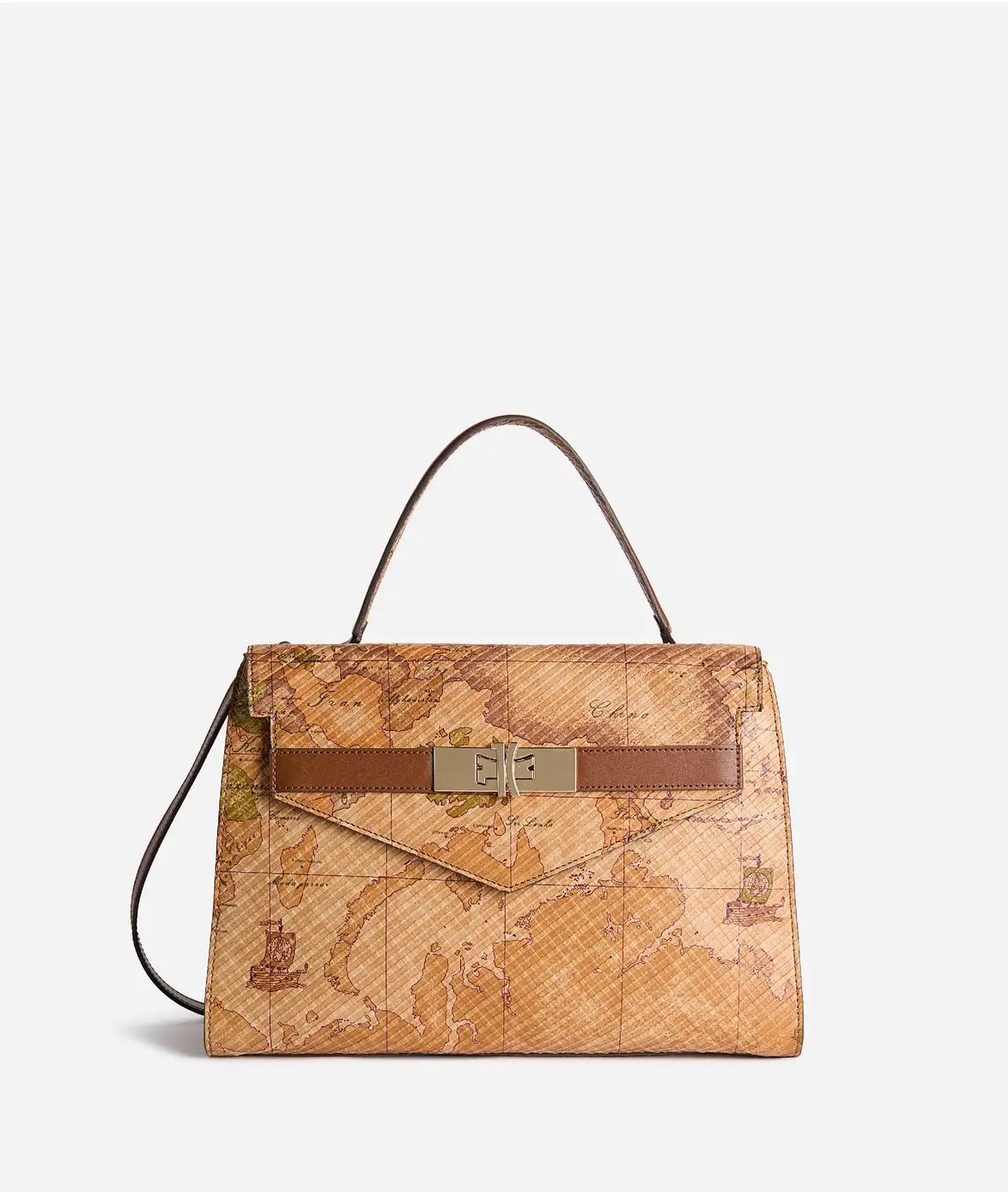 La mappa Geo Classic esprime regalitĂ nella Royal Bag, modello emblema della Collezione Destiny Land. Il look è strutturato e al contempo morbido: la modelleria svasata rientra sui fianchi valorizzando la soffice nappa con impressione Tartan, ispirata ai tessuti iconici che rappresentano i clan scozzesi. Il motivo si ripete sull’interno del manico imbottito in pelle liscia color Cuoio. La patta sagomata a diamante è attraversata dalla banda in pelle liscia e chiude la tasca frontale attraverso il nuovo girello logato 1C, un tocco prezioso che richiama la forma di un quadrifoglio. La chiusura con banda in pelle liscia e magnete svela due scomparti, divisi da una tasca chiusa con zip e dotati di ulteriori tasche interne. Con tracolla regolabile e rimovibile e un design curato in ogni dettaglio, donerĂ agli outfit della stagione un’impronta iconica e lussuosa.