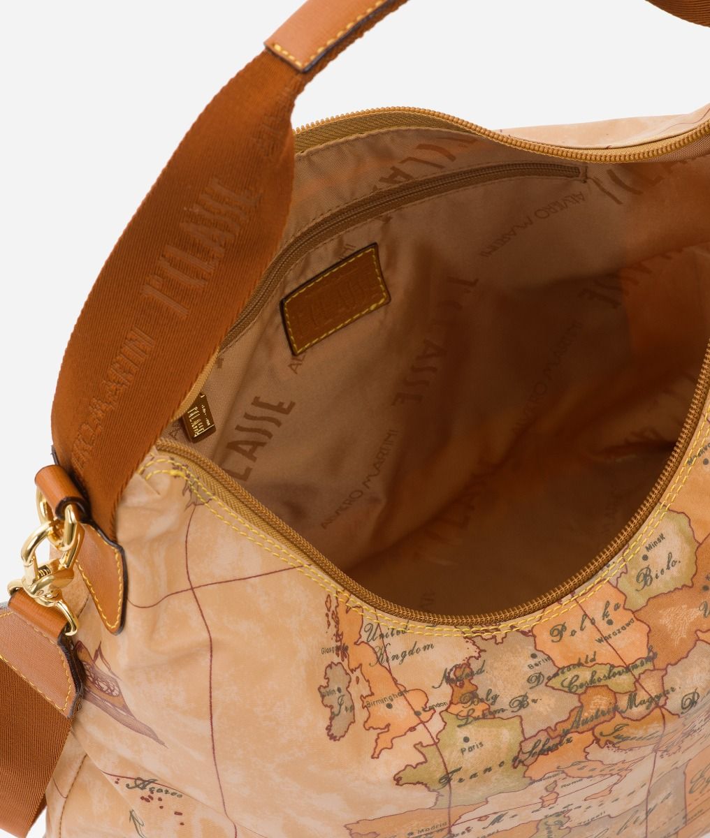 Borsa sottospalla in tessuto Geo Soft Classic. Colore: Naturale. Tracolla regolabile e removibile in nastro logato 1AClasse. Luce tracolla: 63 cm. Luce manico: 26 cm. Chiusura con zip. Fodera in poliestere color naturale con logo 1AClasse.