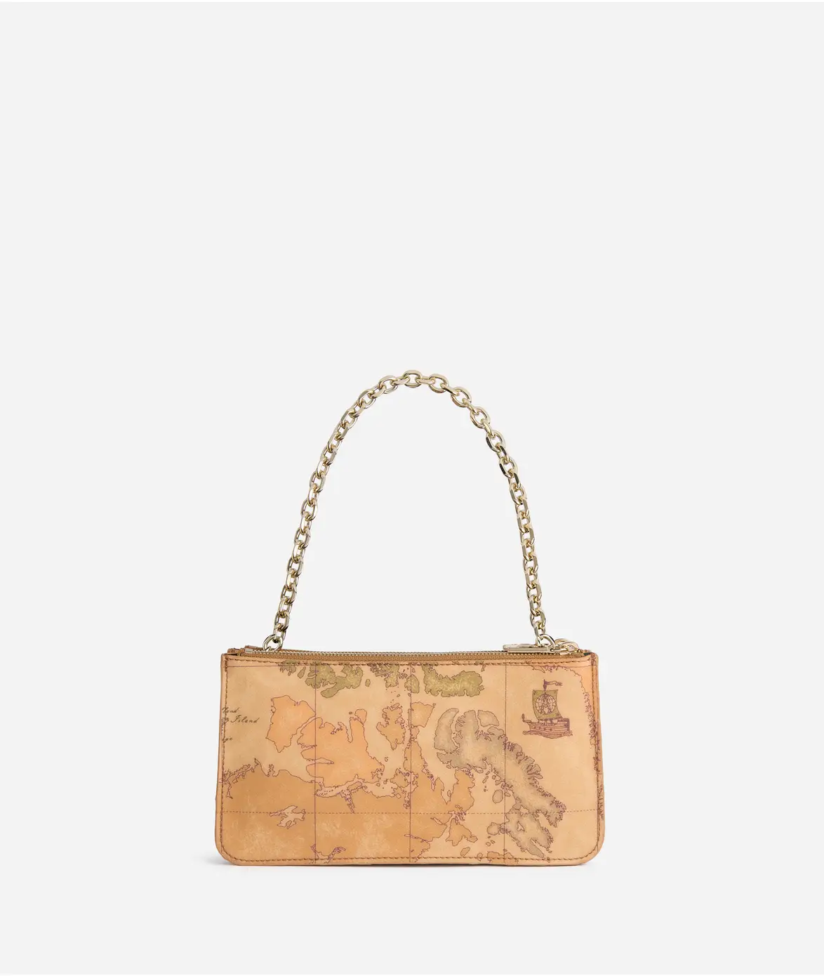Nuovo modello di Collezione, la tracollina a doppio scomparto si ricopre dell’amato tessuto Geo Classic, valorizzato dall’inserto centrale in pelle granata fine. Il look è illuminato dall’oro chiaro della fibbietta logata 1C e del manico in catena, da alternare alla tracolla rimovibile in pelle granata se si preferisce la portabilitĂ crossbody. Attitude iconica e dettagli unici per completare i look da sera con eleganza e personalitĂ .
